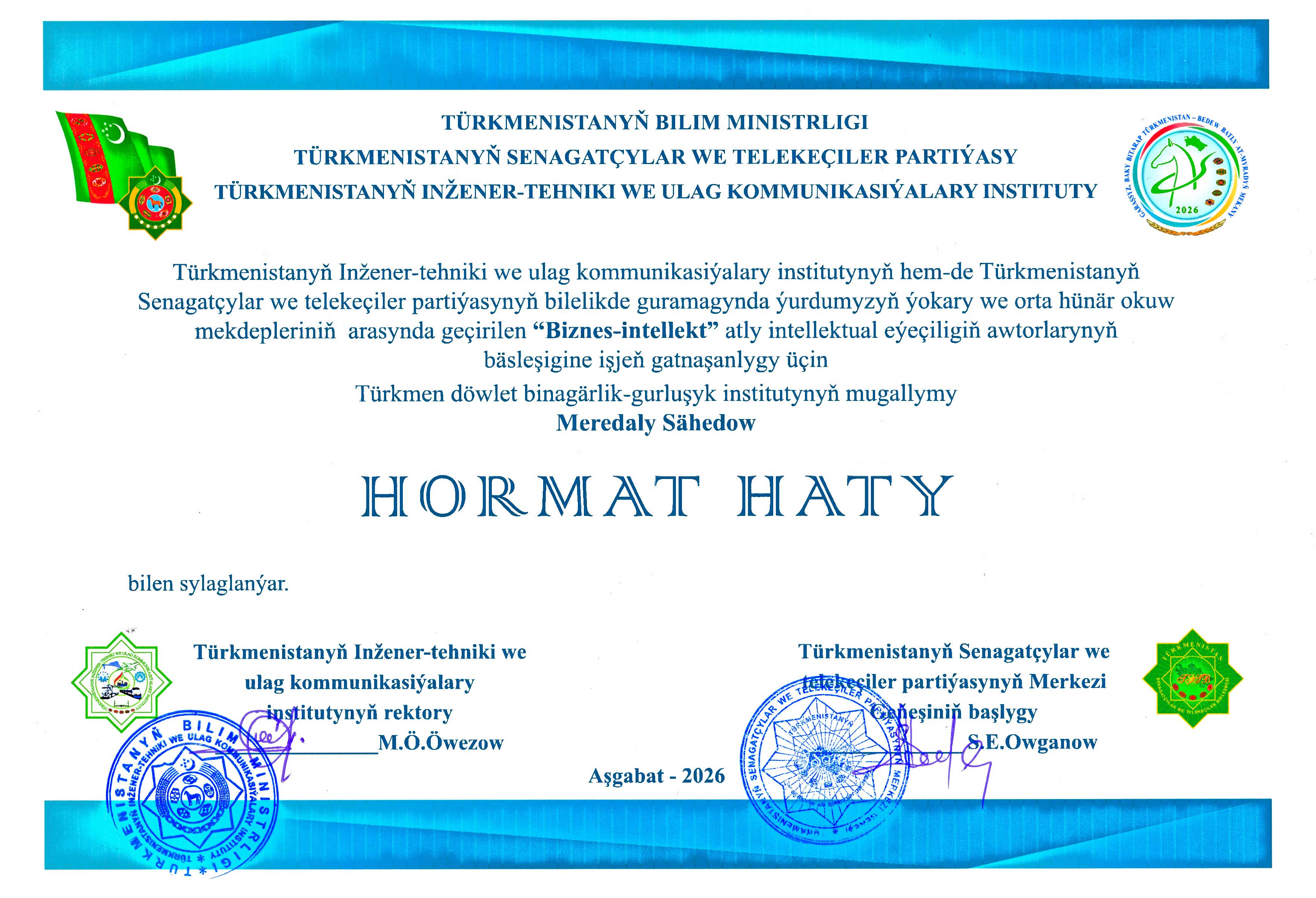 Türkmen döwlet binagärlik-gurluşyk institutynyň mugallymy Meredaly Sähedow ýurdumyzyň ylym-bilim giňişliginde özüniň döredijilikli we täzeçil çemeleşmeleri bilen tapawutlanmagyny dowam edýär. Ol ýaňy-ýakynda Türkmenistanyň Inžener-tehniki we ulag kommunikasiýalary instituty hem-de Türkmenistanyň Senagatçylar we telekeçiler partiýasynyň bilelikde guramagynda geçirilen “Biznes-intellekt” atly intellektual eýeçiligiň awtorlarynyň bäsleşiginde ýokary işjeňlik görkezdi. Bu çäre ýaş hünärmenleriň innowasion taslamalaryny hödürlemekde möhüm platforma öwrüldi.